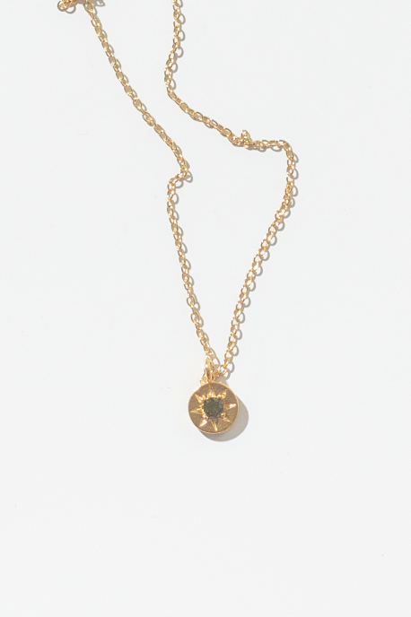 This delicate circular disc necklace featuring a textured star design with a central olive green crystal. Perfect for adding a little sparkle to your outfit or layering with your other favourite necklaces. The round charm is paired with our adjustable Gold Plated Sterling Silver adjustable 16-18inch chain.