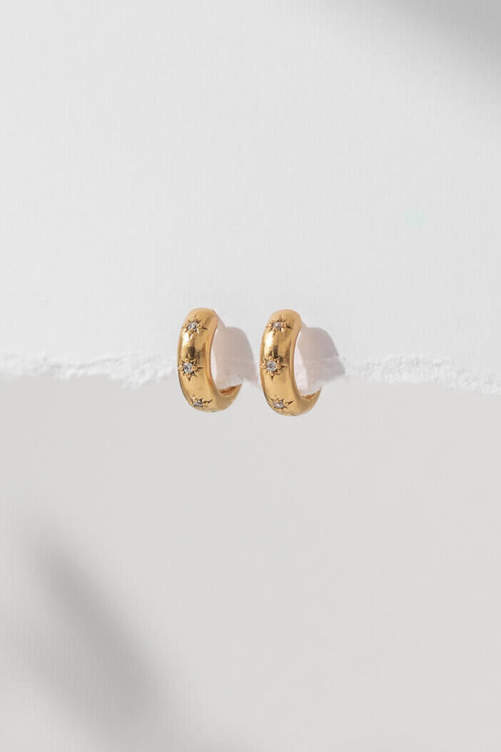 Our Gold Crystal Cosmic Huggies feature declicate star-shaped crystals. These elegant, striking hoops secure with a hinge closure and come presented in a reusable glass bottle. The perfect addition to your ear stack.