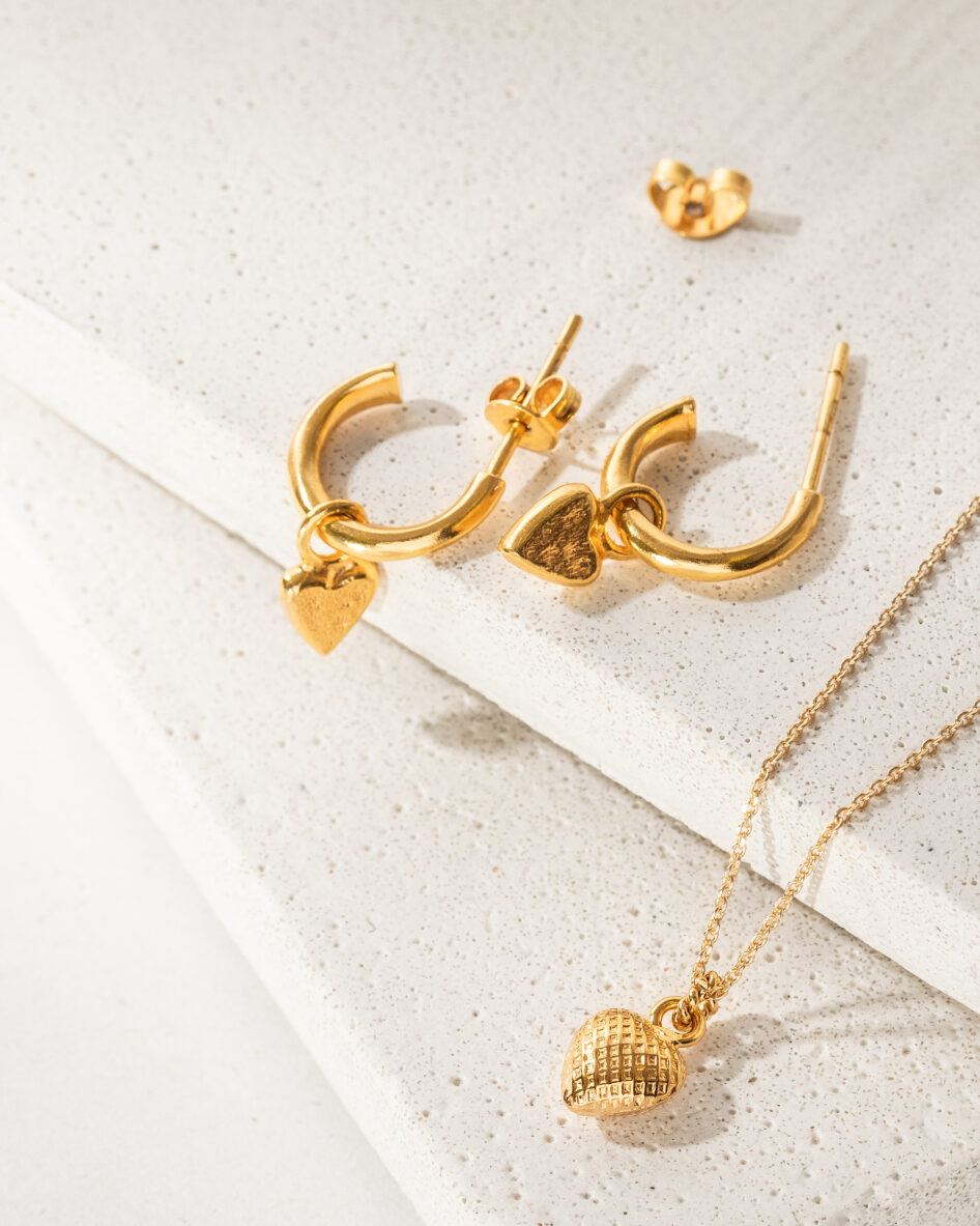 These contemporary statement earrings are a perfect addition to your spring jewellery wardrobe. Don’t feel like wearing hearts? Just add the statement hoops to elevate your outfit.