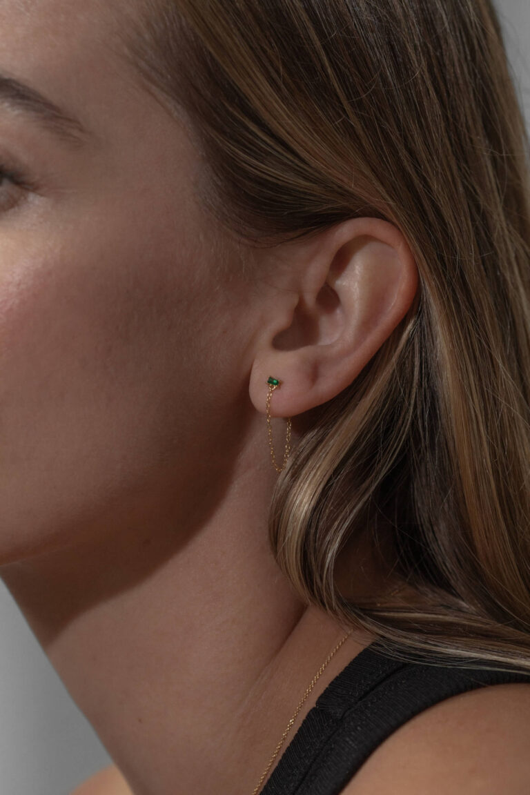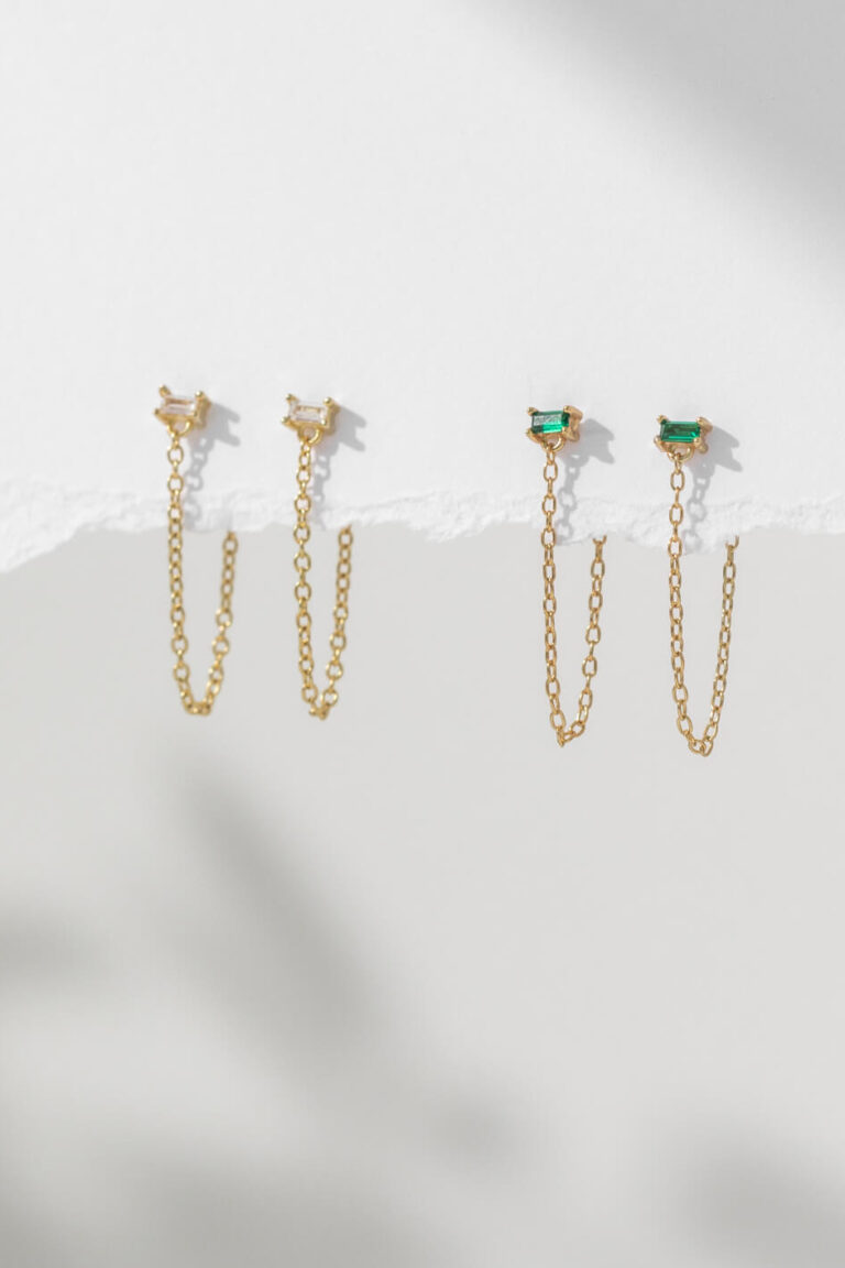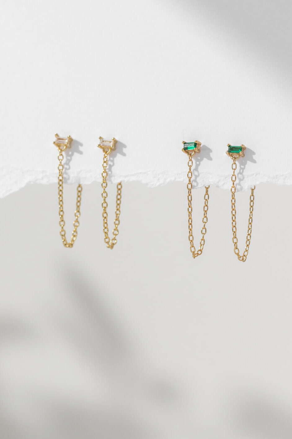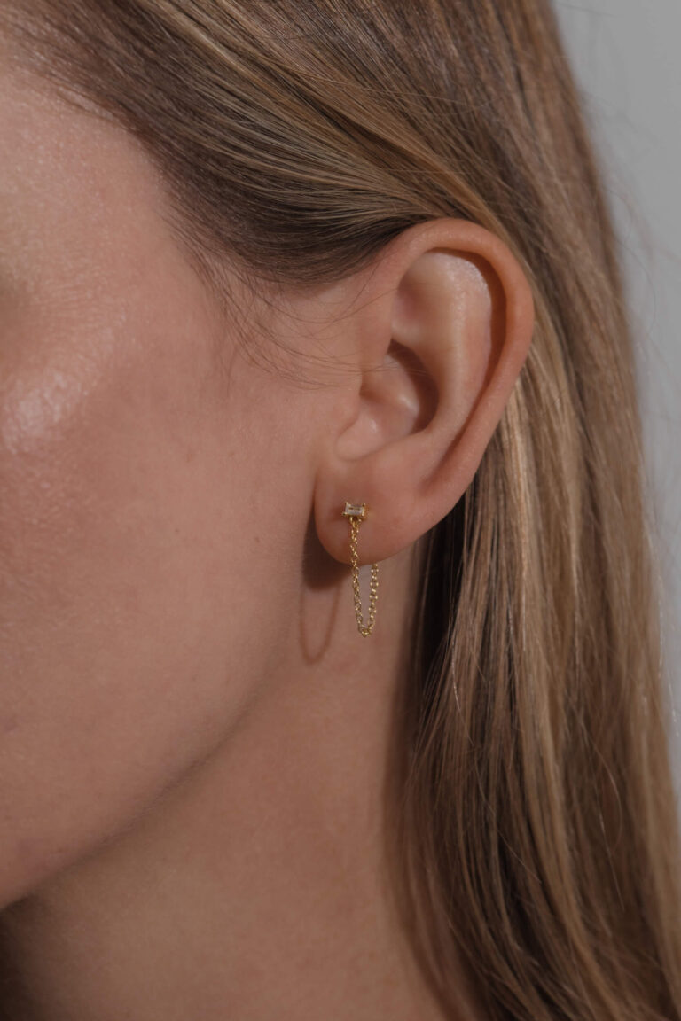 Elevate your style with our new Ilena Crystal Chain Earrings. These elegant studs feature a mini stud with a chain drop, which attaches to the earring butterfly. A perfect member of your ear stack. Cool, simple, striking.