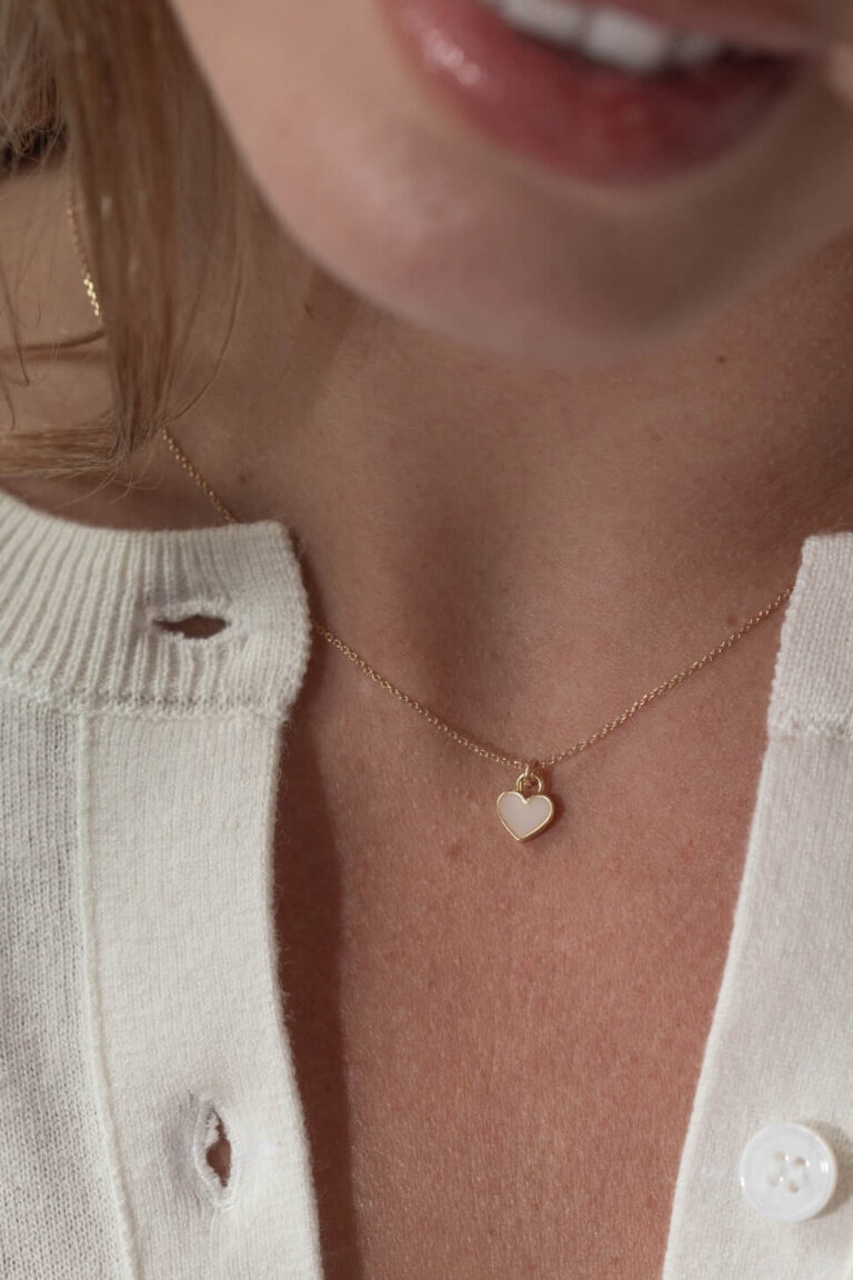 Add a little romance to your outfit with our cute Latte, light cream, Enamel Heart Necklace. Our Enamel Heart charm hangs from a delicate 16″ Gold Plated Sterling Silver Chain. Gift packaged in our signature glass bottle, this necklace is a dainty stand alone piece or can be layered with your other favourite chains.