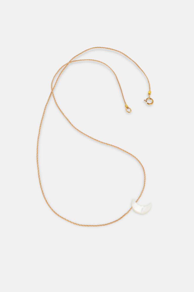 The Moonrise Necklace is the perfect addition to your summer wardrobe. The delicate mother of pearl charm hangs from a natural-coloured silk cord, adding a subtle and elegant touch to your outfit.