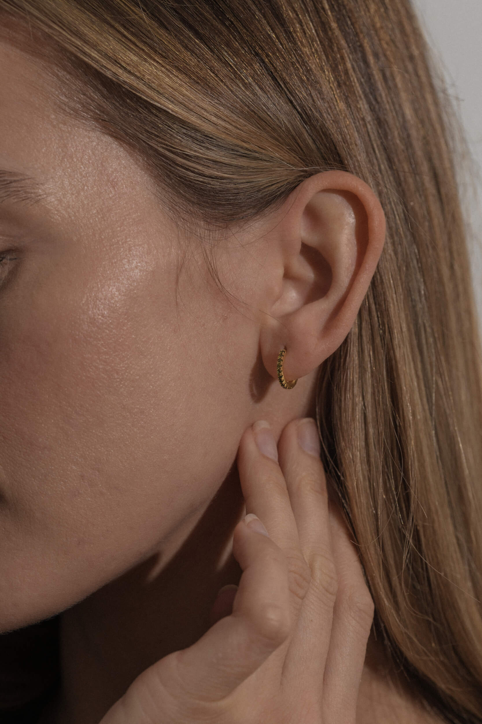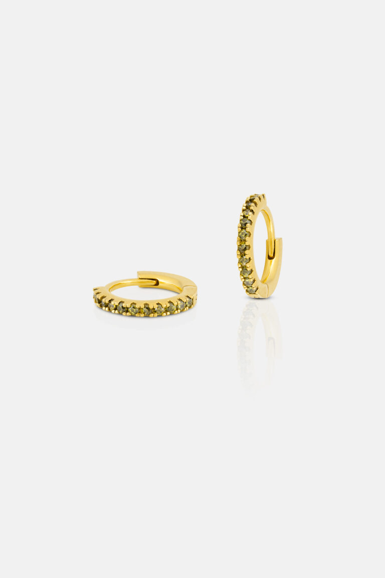 Our bestselling Treasured Huggie Earrings, now featuring a delicate row of olive green glass charms. These hoops have a hinge closure and offer exceptional comfort for effortless all-day wear.