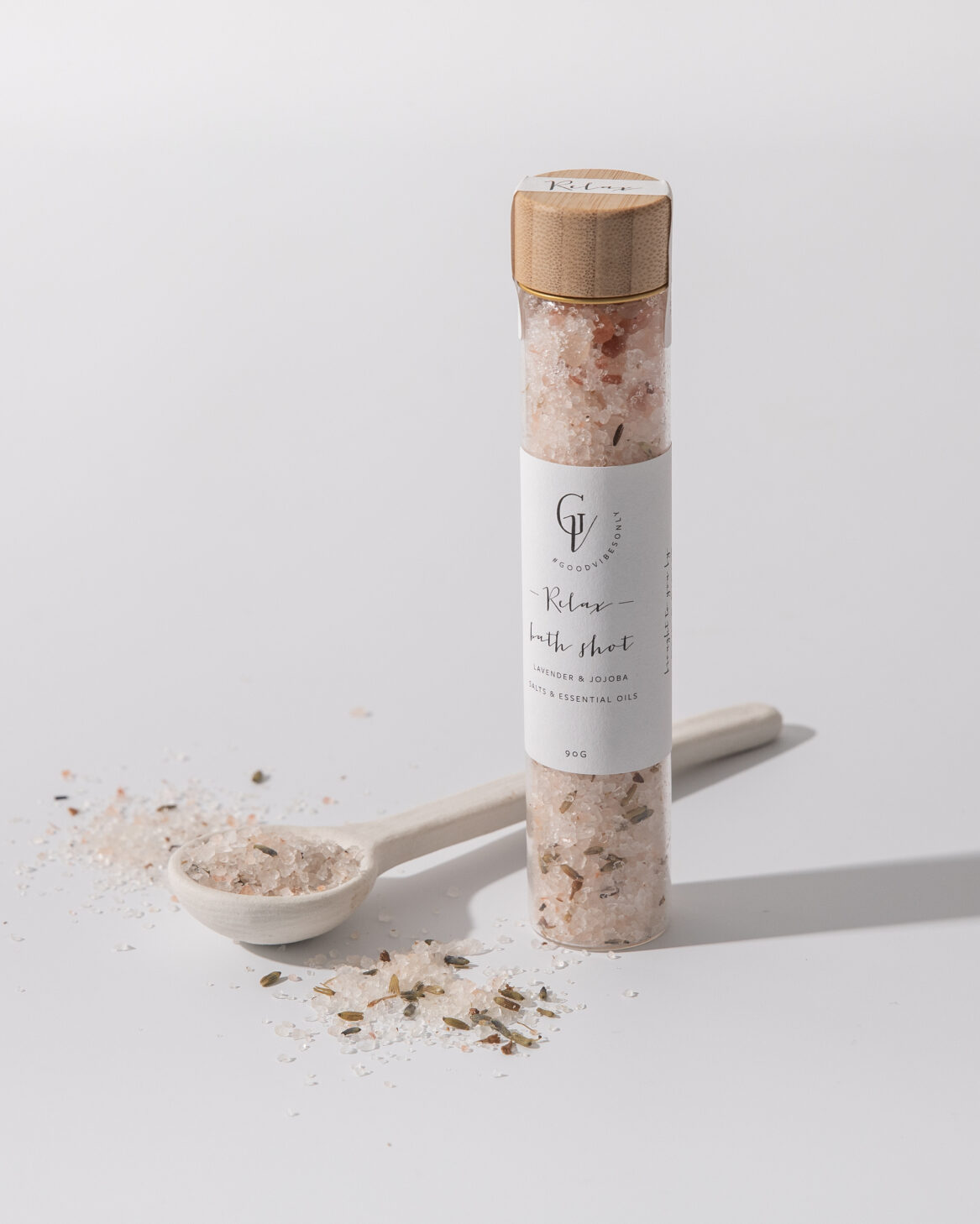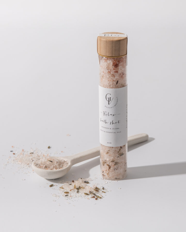 90g of restorative bath salts in each glass shot