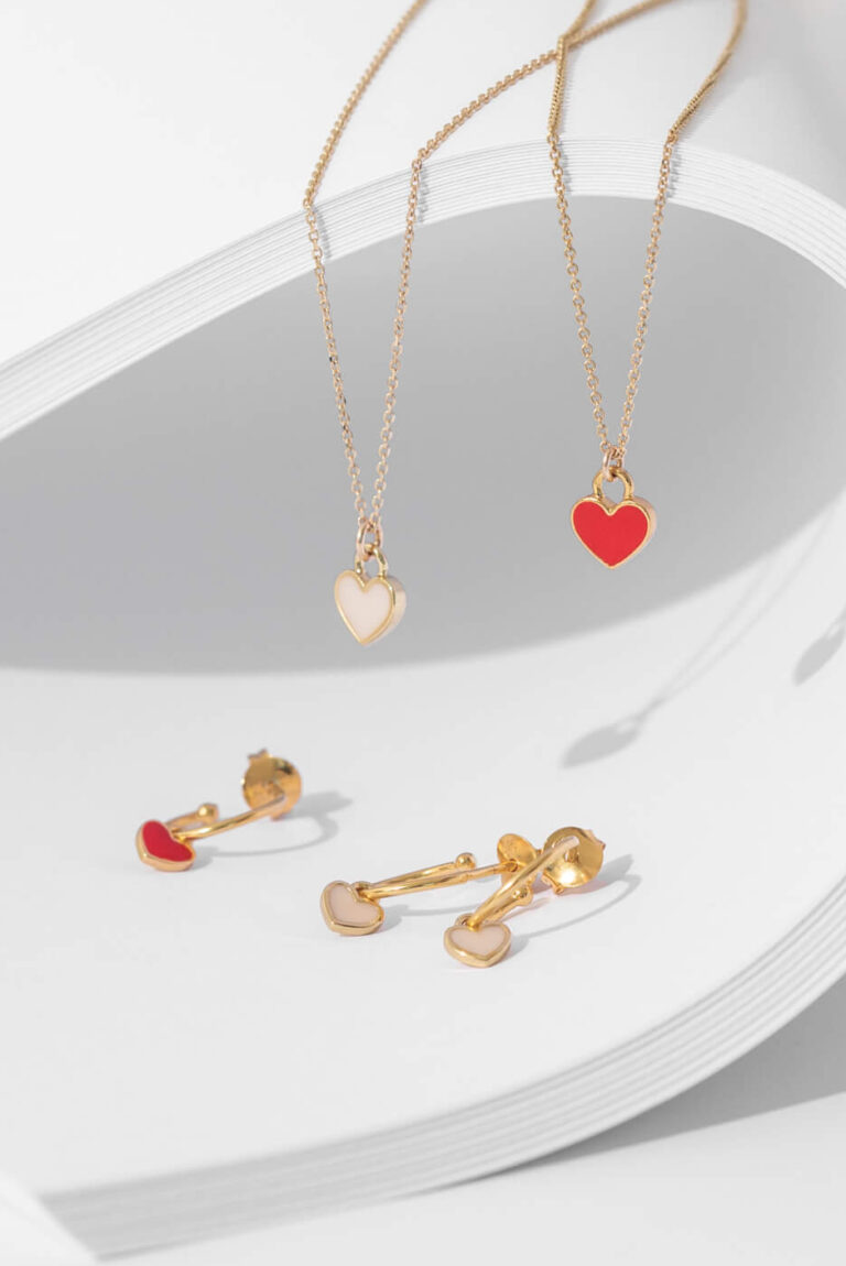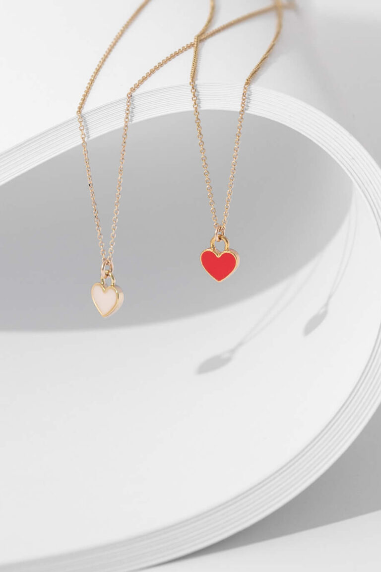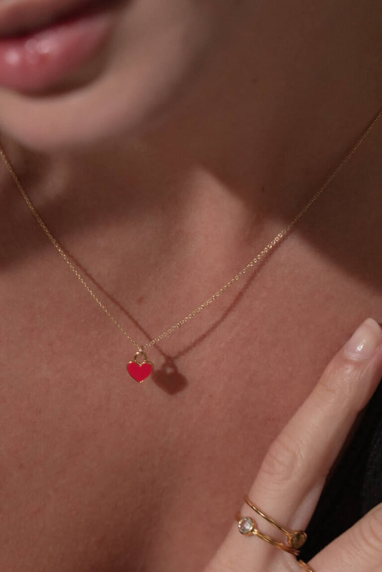 Add a little romance to your outfit with our cute Ruby Red Enamel Necklace. Our ruby red Enamel Heart Necklace charm hangs on our fine Gold Plated Sterling Silver 16″ delicate chain to create striking yet classic piece of jewellery. Wear on its own, or make the perfect stack with any of our contemporary collections.