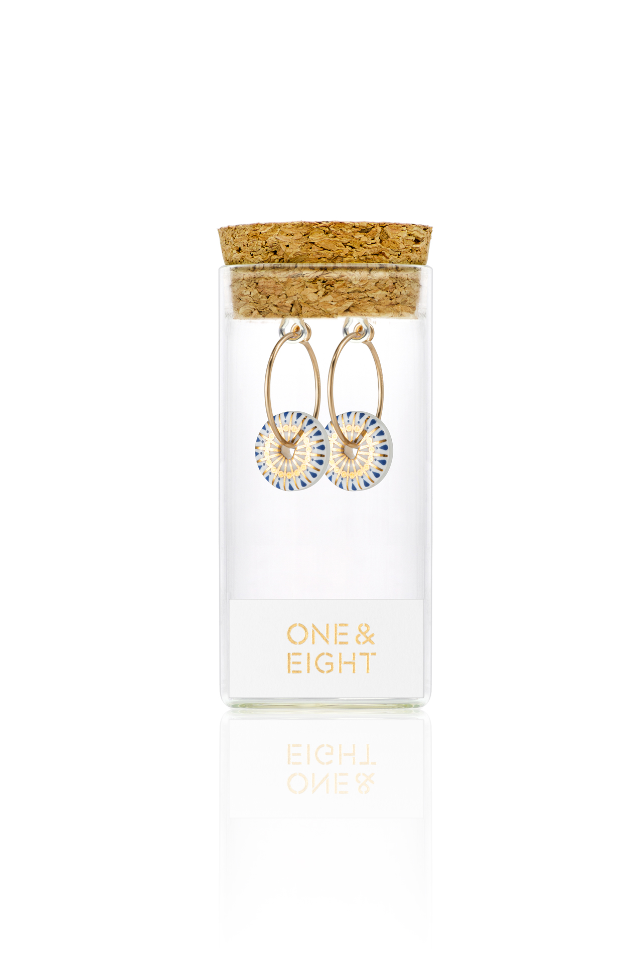 Our best selling Porcelain Etta Earrings are handmade in our Devon studio. The white porcleain discs are finished with a contemporary blue and gold design. Beautifully packaged in a glass bottle, they make the perfect gift or a treat for yourself.